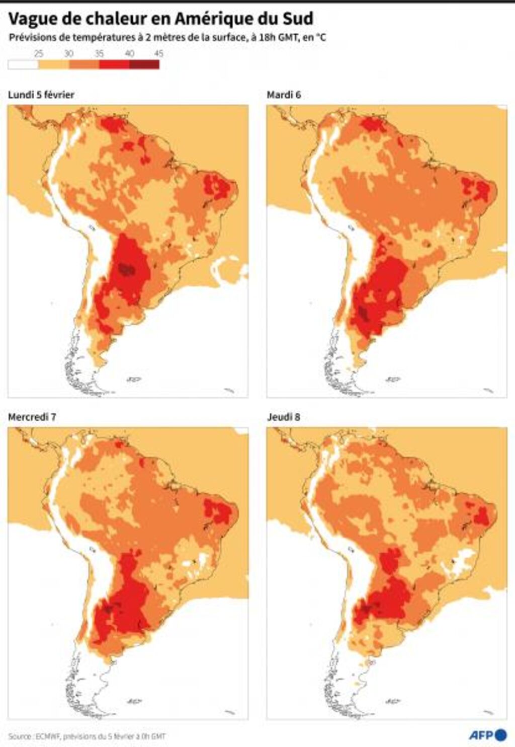 Cette canicule résultant du phénomène climatique El Niño touche actuellement le cône sud de l'Amérique latine, en pleine période estivale, provoquant des incendies de forêt aggravés par le réchauffement climatique. Après le Chili et la Colombie, la vague de chaleur menace dans les prochains jours l'Argentine, le Paraguay et le Brésil.