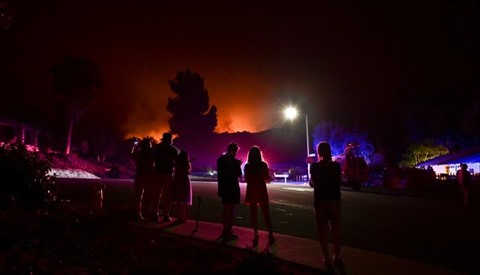 | Des habitants regardent le Bobcat Fire sur les collines environnantes, depuis Arcadia, au nord de Los Angeles en Californie, le 13 septembre. |
