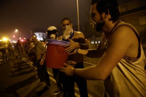 | La population forme une chaîne humaine pour aider les pompiers dans leur lutte contre les incendies, le 15 octobre à Vigo, en Espagne. |
