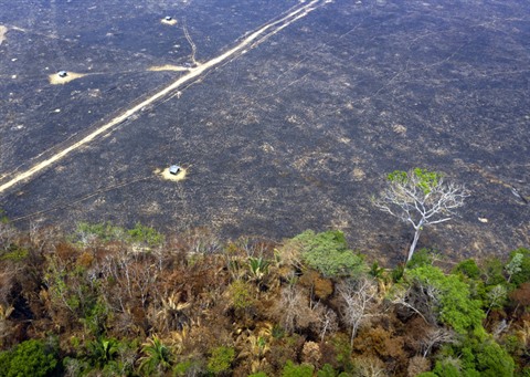 | Vue aérienne de secteurs brûlés dans la forêt amazonienne, près de Porto Velho (Nord-Ouest du Brésil), le 24 août |