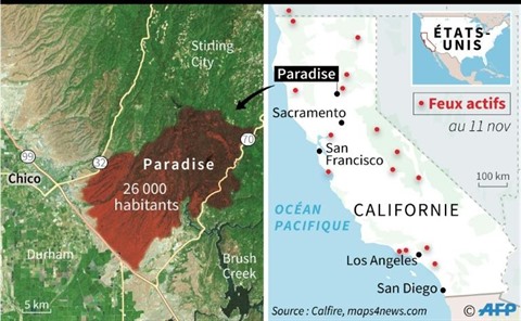 | Localisation des incendies actifs en Californie et carte localisant Paradise où des milliers d'habitants autour de la ville ont dû évacuer face à l'avancée d'un incendie qui se propageait rapidement. |