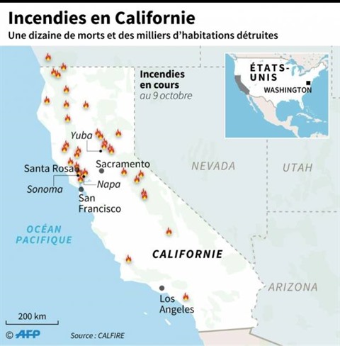 | Localisation des principaux incendies en Californie qui ont fait une dizaine de morts depuis le 9 octobre. |