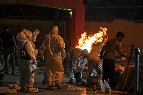 | Des proches assistent à la crémation d'une personne décédée du COVID-19 au crématorium Nigambodh Ghat à New Delhi, en Inde, le 28 avril. |