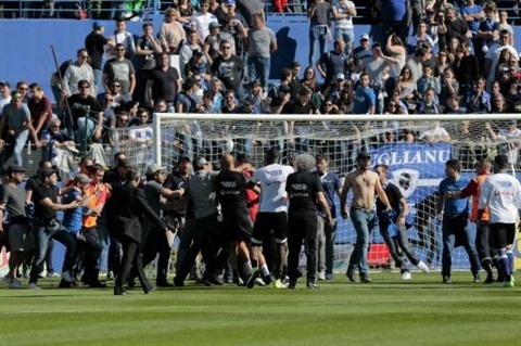 | Des supporters bastiais envahissent la pelouse du stade Armand-Cesari, le 16 avril . |