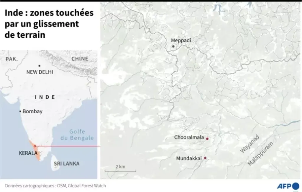 L'État côtier du Kerala a été frappé à l'aube par des averses torrentielles, et les routes menant à la zone sinistrée du district de Wayanad sont bloquées, rendant compliquées les opérations de secours.