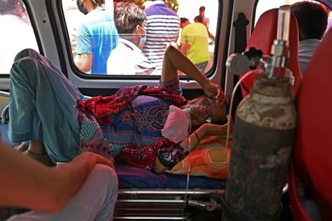 | Un malade du COVID-19 respire à l'aide d'oxygène fourni par les bénévoles d'un temple sikh, à Ghaziabad, près de New Delhi, le 26 avril |