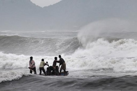 | Des pêcheurs indiens tentent de sortir leur barque des fortes vagues le 11 octobre à Visakhapatnam alors que le cyclone Hudhud arrive sur les côtes de l'Inde. |