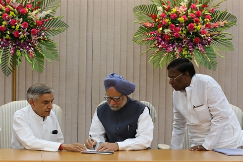 | Le Premier ministre indien, Manmohan Singh (centre), le 26 juin à New Delhi. |