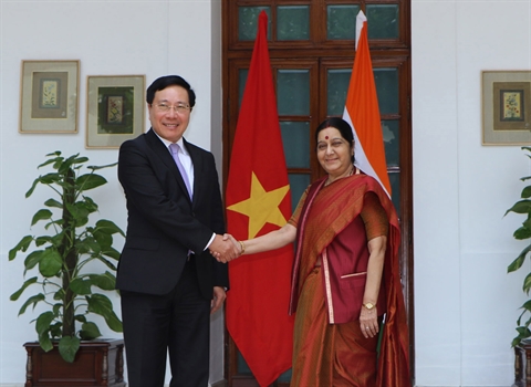 | Le vice-Premier ministre et ministre vietnamien des Affaires étrangères (AE), Pham Binh Minh, et la ministre indienne des AE, Sushma Swaraj. |