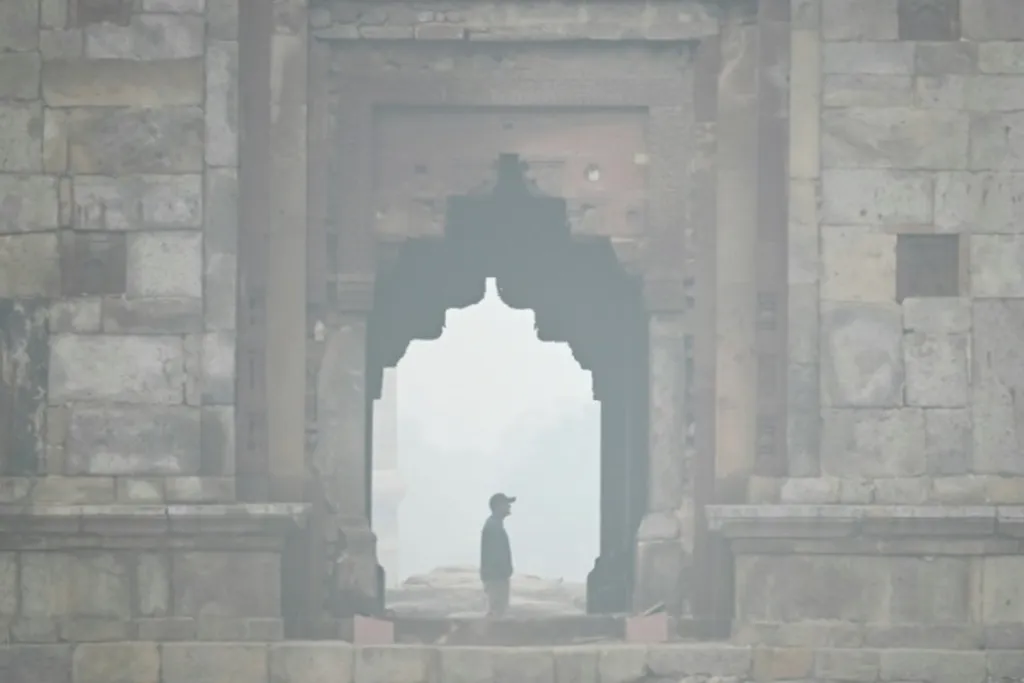 | Un homme visite les jardins de Lodi en plein pic de pollution atmoshérique à New Delhi le 18 novembre. |
