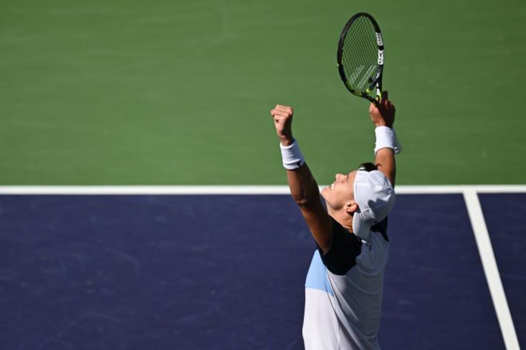| Le Danois Holger Rune célèbre sa victoire sur le Russe Daniil Medvedev lors de la demi-finale du simple messieurs à Indian Wells, en Californie, le 15 mars. |