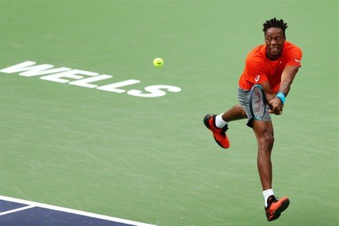 | Gaël Monfils fait un revers, lors de son match contre Albert Ramos-Vinolas à Indian Wells, le 11 mars. |