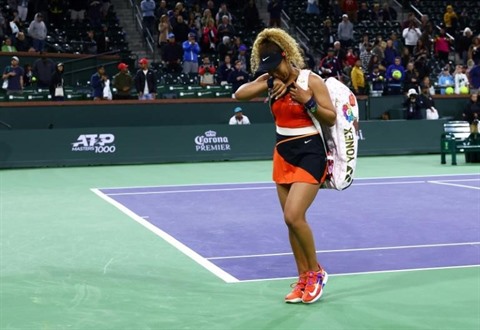 | Naomi Osaka quitte le court en larmes après sa défaite au 2e tour du tournoi d'Indian Wells contre la Russe Veronika Kudermetova, le 12 mars. |