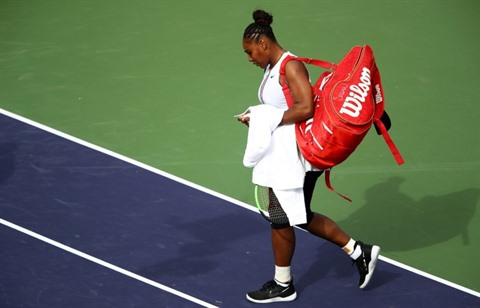 | Serena Williams, en proie à des vertiges face à Garbine Muguruza, quitte le court alors qu'elle était menée, au 3e tour à Indian Wells, le 10 mars. |