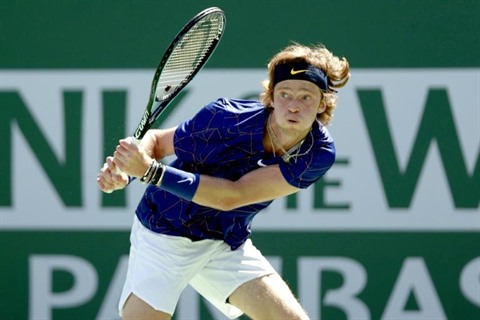 | Le Russe Andrey Rublev face au Bulgare Grigor Dimitrov à Indian Wells, le 18 mars. |