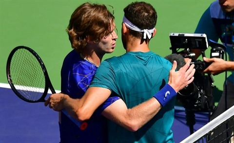 | Accolade entre Andrey Rublev et Grigor Dimitrov à l'issue de leur match à Indian Wells, le 18 mars. |