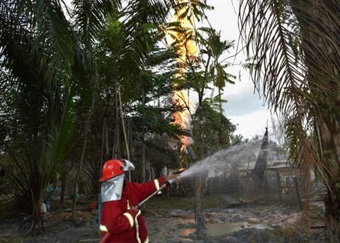 | Des pompiers indonésiens tentent d'éteindre l'incendie d'un puits de pétrole illégal à Peureulak, le 25 avril. |