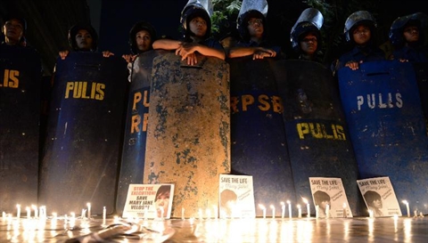 | Des policiers anti-émeute protègent l'ambassade d'Indonésie à Manille devant laquelle ont été déposées des bougies et des photos de Mary Jane Veloso, condamnée à mort en Indonésie. |