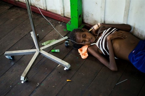 | Une enfant malade git à même le sol dans l'hôpital d'Agats, en Papouasie indonésienne, le 25 janvier. Photo : AFP/VNA/CVN |