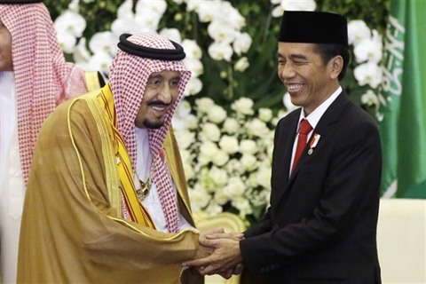 | Le roi d’Arabie saoudite (gauche) et le président d'Indonésie Joko Widodo. |