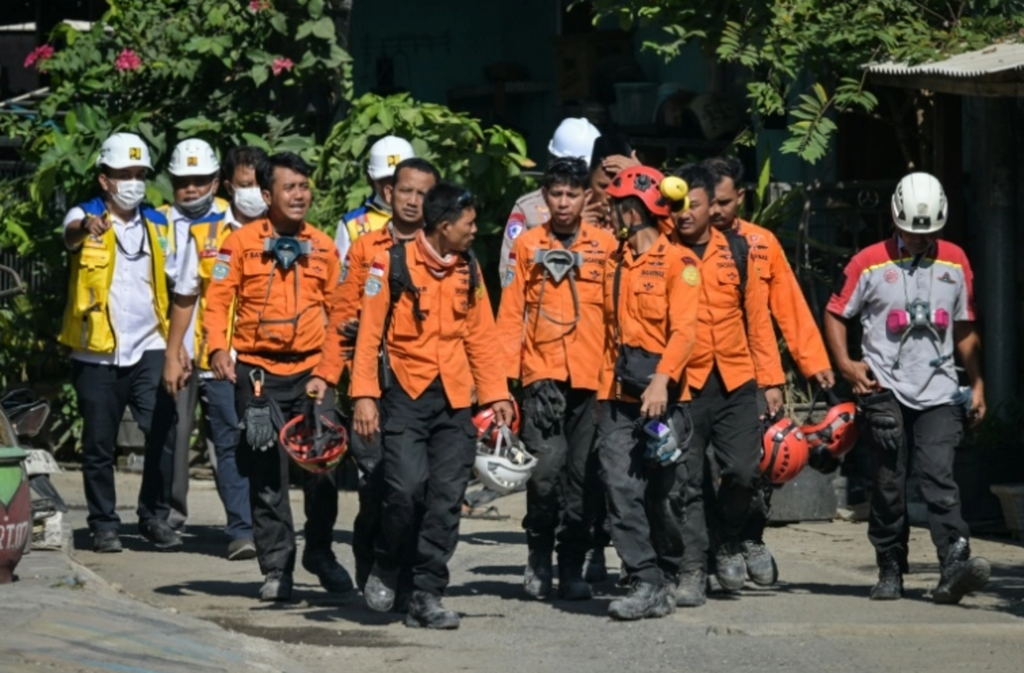 | Des membres des équipes de secours quittent le site de l'effondrement de l'internat islamique Al Khoziny à Sidoarjo, dans l'Est de Java, le 6 octobre en Indonésie |