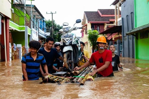 | Des personnes affectées par les inondations transportent un scooter sur un radeau de fortune, le 23 janvier à Makassar, en Indonésie. |
