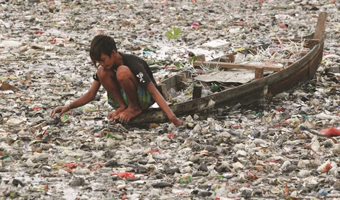 | Un garçon à bord d’une barque au milieu des déchets de toute sorte sur le Citarum. |