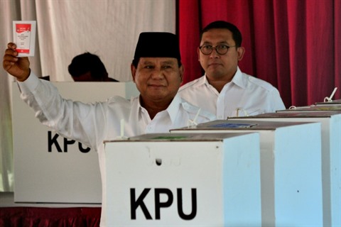 | Le général Prabowo Subianto se prépare à déposer son bulletin de vote dans l'urne, à Bogor le 17 avril. |