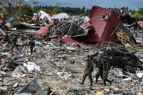 | Des soldats recherchent des victimes dans les décombres de Petobo, le 8 octobre en Indonésie. |
