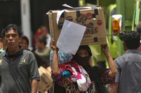 | Une femme transporte un colis d'aide après le séisme et le tsunami qui ont frappé l'île des Célèbes, à Palu en Indonésie le 8 octobre. |