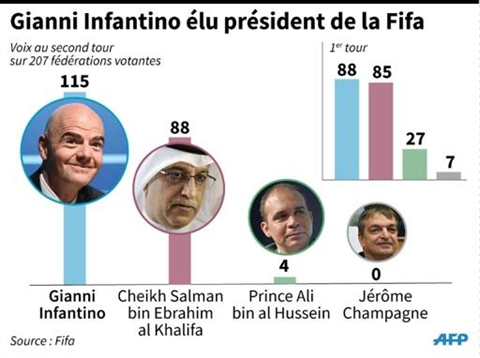 "Infantino, c'était le cerveau de l'UEFA, un ordinateur", a insisté le président de la Fédération polonaise. Le nouveau président avait déjà basculé en tête au 1er tour en recueillant 88 voix, juste devant le Cheikh Salman (85) et loin devant les deux autres postulants. Peu avant le début du scrutin, le Sud-Africain Tokyo Sexwale, ex-militant anti-apartheid aux côtés de Nelson Mandela, avait annoncé qu'il abandonnait la bataille.