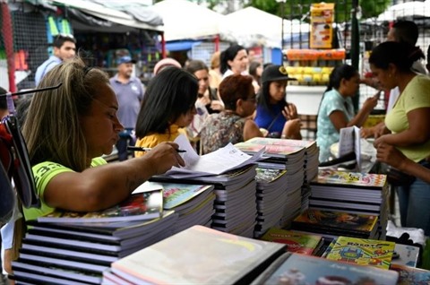 | Des mères de famille achètent des cahiers sur un marché à Caracas, le 11 septembre 2019. |