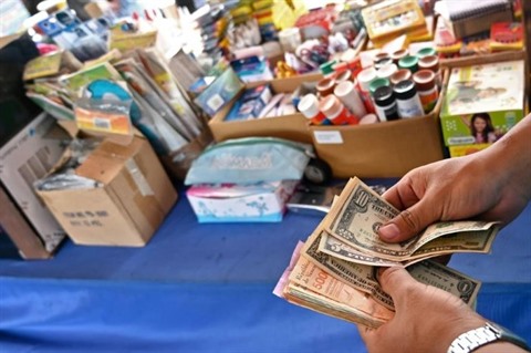 | Un vendeur de fournitures scolaires compte son argent à Caracas, le 11 septembre 2019. |