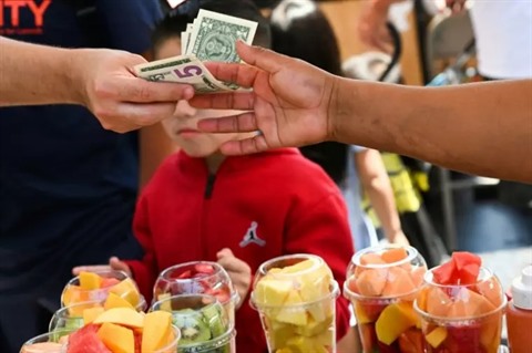 | Un vendeur de fruits frais sur Hollywood Boulevard à Los Angeles (Californie) le 13 juillet. |