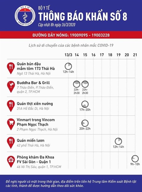 Des patients étaient allés, à Hanoï, au restaurant "173 Thai Hà" (qui vend du bun dau mam tôm - nouilles blanches avec morceaux de tofu rissolé) situé dans la ruelle N°13, rue Thai Hà le 13 mars, entre 12h et 14h ; au restaurant de "miên luon" (vermicelles translucides aux anguilles des marais séchées accompagné de germes de soja) au 42 de la même rue le 19 mars, de 9h à 10h ; au restaurant de viande rôtis sur des brochettes au 31A, rue Hô Dac Di le 15 mars, de 17h à 20h ; au supermarché Vinmart dans le centre commercial Vincom, rue Pham Ngoc Thach, le 15 mars, de 20h à 22h.