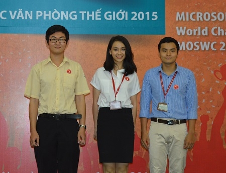 | Les trois gagnants du concours d'informatique bureautique Microsoft Office Specialist World Championship 2015, le 16 juin à Hanoi. |