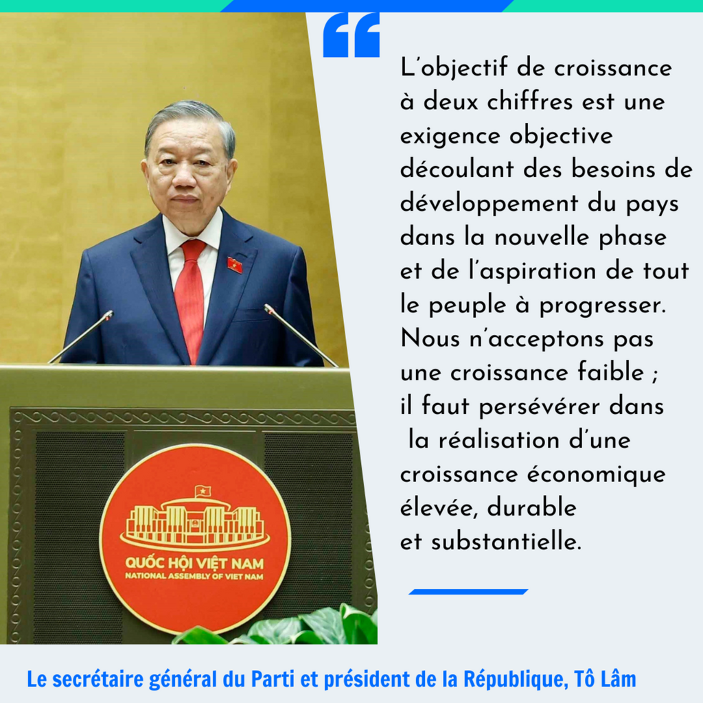 Dans son discours de clôture du 2e plénum du Comité central du Parti du XIVe mandat, tenu fin mars, le secrétaire général Tô Lâm a affirmé : "L’objectif de croissance à deux chiffres est une exigence objective découlant des besoins de développement du pays dans la nouvelle phase et de l’aspiration de tout le peuple à progresser. Nous n’acceptons pas une croissance faible ; il faut persévérer dans la réalisation d’une croissance économique élevée, durable et substantielle".