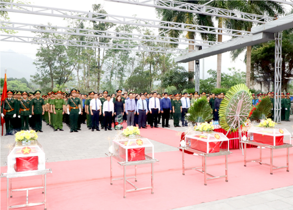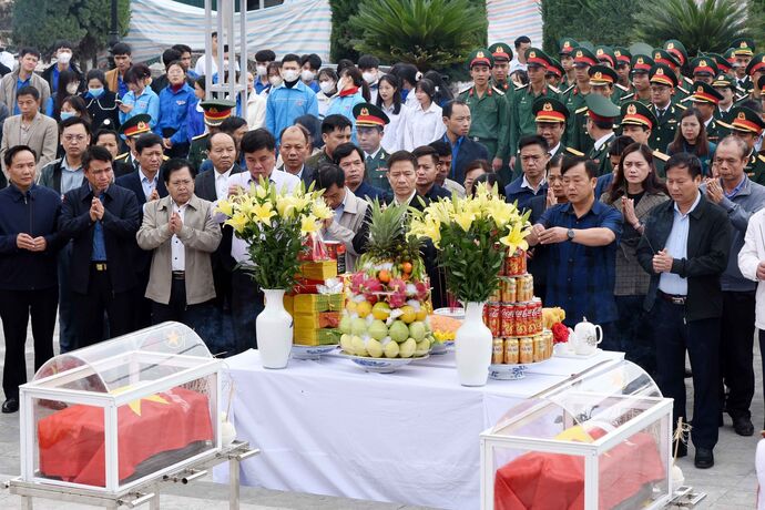 | Cérémonie d’inhumation des restes de neuf soldats tombés dans la combat pour protéger la frontière septentrionale de la Patrie, au cimetière national des Morts pour la Patrie de Vi Xuyên. |