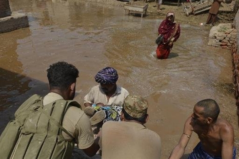 | Des soldats pakistanais évacuent les victimes des inondations à Sher Shah, le 13 septembre, dans la province du Punjab. |