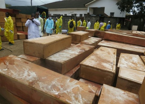 | Cercueils des victimes des inondations, le 17 août, avant leur transport vers un cimetière à Freetown. |