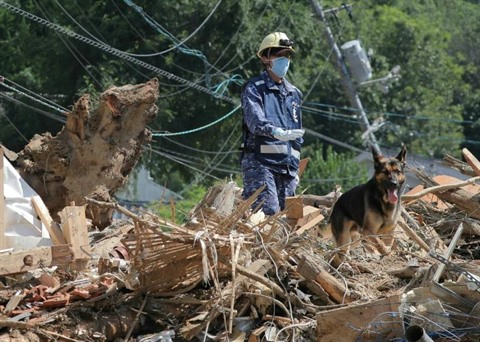 | Un membre des équipes de secours recherche des personnes survivantes, le 12 juillet à Kure, après les fortes inondations dans l'Ouest du Japon |