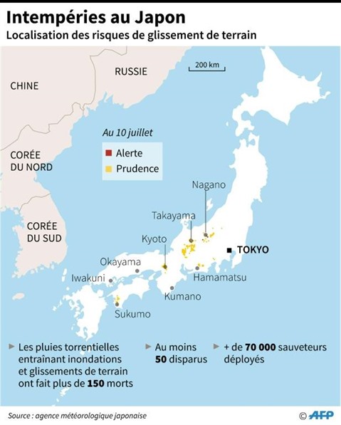 | Carte du Japon localisant les risques de glissements de terrain après les fortes pluies qui ont fait près de 200 morts |