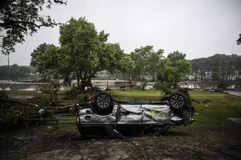 | Une voiture retournée par la crue du fleuve Guadalupe à Hunt, au Texas (États-Unis), le 5 juillet. |