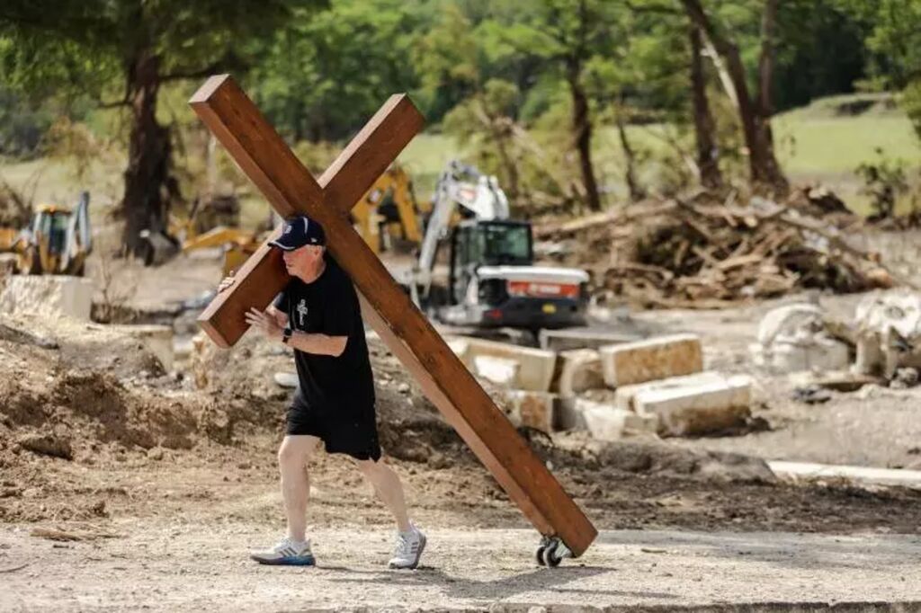 | Un homme marche sur les rives du fleuve Guadalupe en emportant une grande croix de bois, à Ingram, Texas, le 8 juillet. |