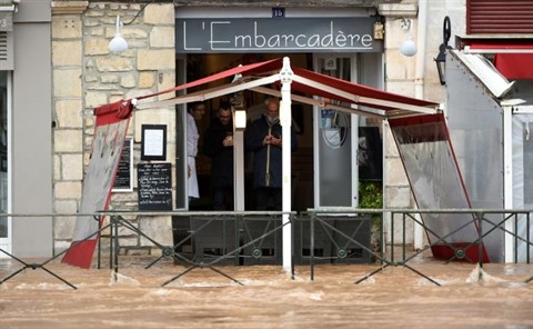 | Les employés d'un restaurant regardent l'eau monter dans une rue inondée de Bayonne, le 10 décembre |