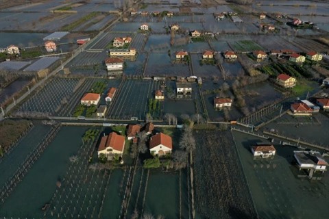 | Vue aérienne prise le 11 janvier du village d'Obot (Albanie), inondé après des pluies diluviennes. |