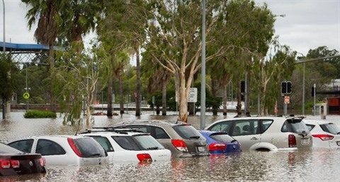 | Des voitures submergée sur le parking de la gare de Beenleigh après le passage du cyclone Debbie, le 31 mars. |