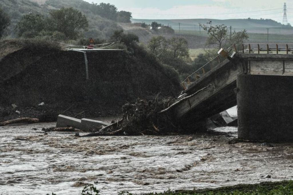 | Un pont effondré après de fortes crues à Farsala, en Grèce, le 7 septembre. |