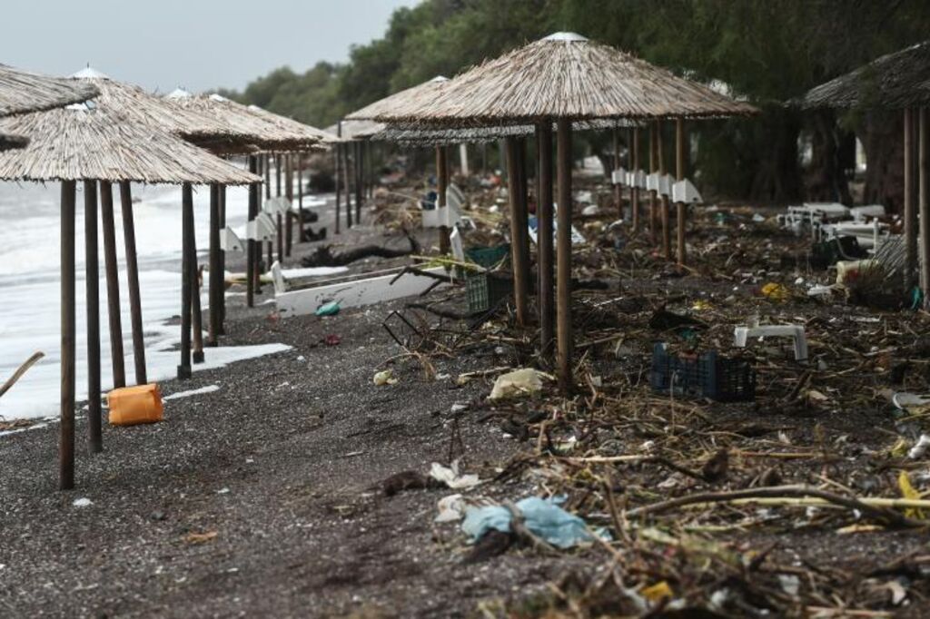 | Un plage envahie par des débris et des déchets après de fortes pluies à Nea Agxialos, près de Volos, dans le Centre de la Grèce, le 7 septembre. |