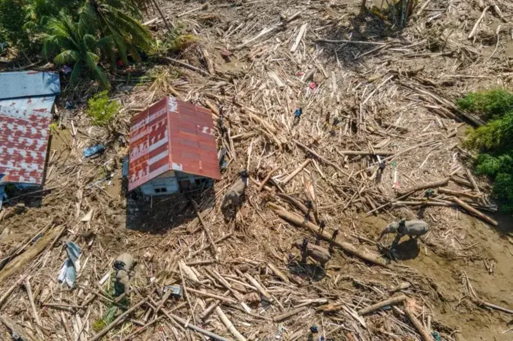 | Vue aérienne d'éléphants de Sumatra aidant à dégager des débris d'arbres après des crues soudaines à Meureudu, dans la province d'Aceh, le 8 décembre en Indonésie. |